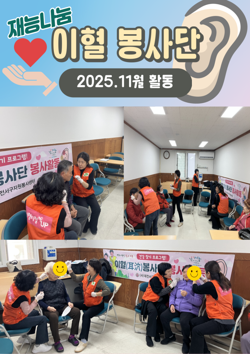2025년 재능나눔 이혈(耳泬) 봉사단 활동(11월) 서구자원 0 5 01-02 (사)대전서구자원봉사센터에서는 2025년 재능나눔 이혈(耳泬) 봉사단 활동 9회차 한밭복지관에서 진행했습니다.