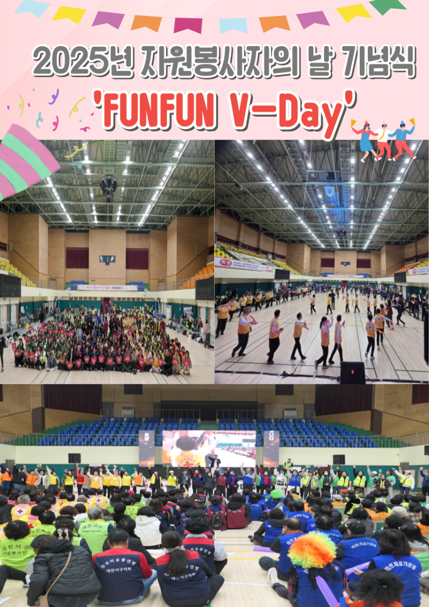 2025년 자원봉사자의 날 기념식 'FUNFUN V-Day' 행사 추진(12월) 서구자원 0 8 01-02 (사)대전서구자원봉사센터에서는 1년 동안 헌신적으로 활동한 자원봉사자들의 노고를 격려하고 자원봉사자 간 화합과 유대감을 높이기 위해‘ FUNFUN V-Day’ 기념 행사를 추진했습니다.