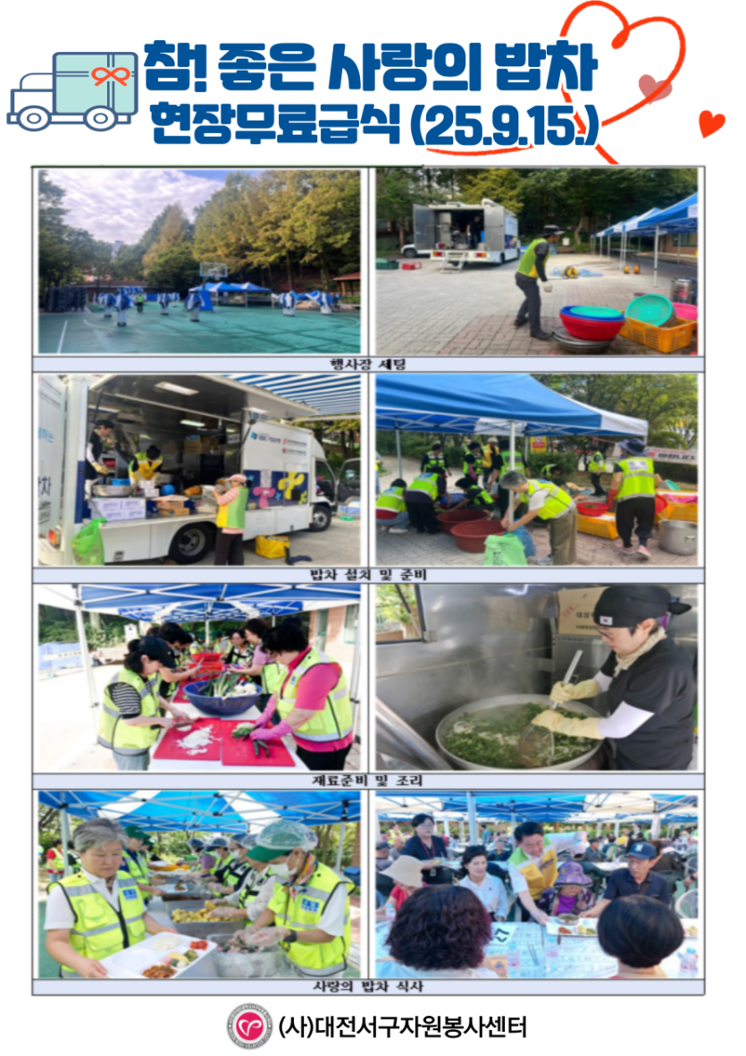 2025년 사랑의 밥차 현장 무료급식 봉사활동 사업 7회차(9월) 서구자원 0 8 11-11 (사)대전서구자원봉사센터에서는 「사랑의 밥차」현장 무료급식 봉사활동 사업 7회차 9월 15일(월) 운영을 마쳤습니다. 관저2동 신선암근린공원 장소 협조하에 400여명을 대상으로 따뜻한 한끼를 제공했습니다. 추후, 안전을 우선으로 사랑의 밥차를 시행할 예정이오니 많은 관심 부탁드리겠습니다.