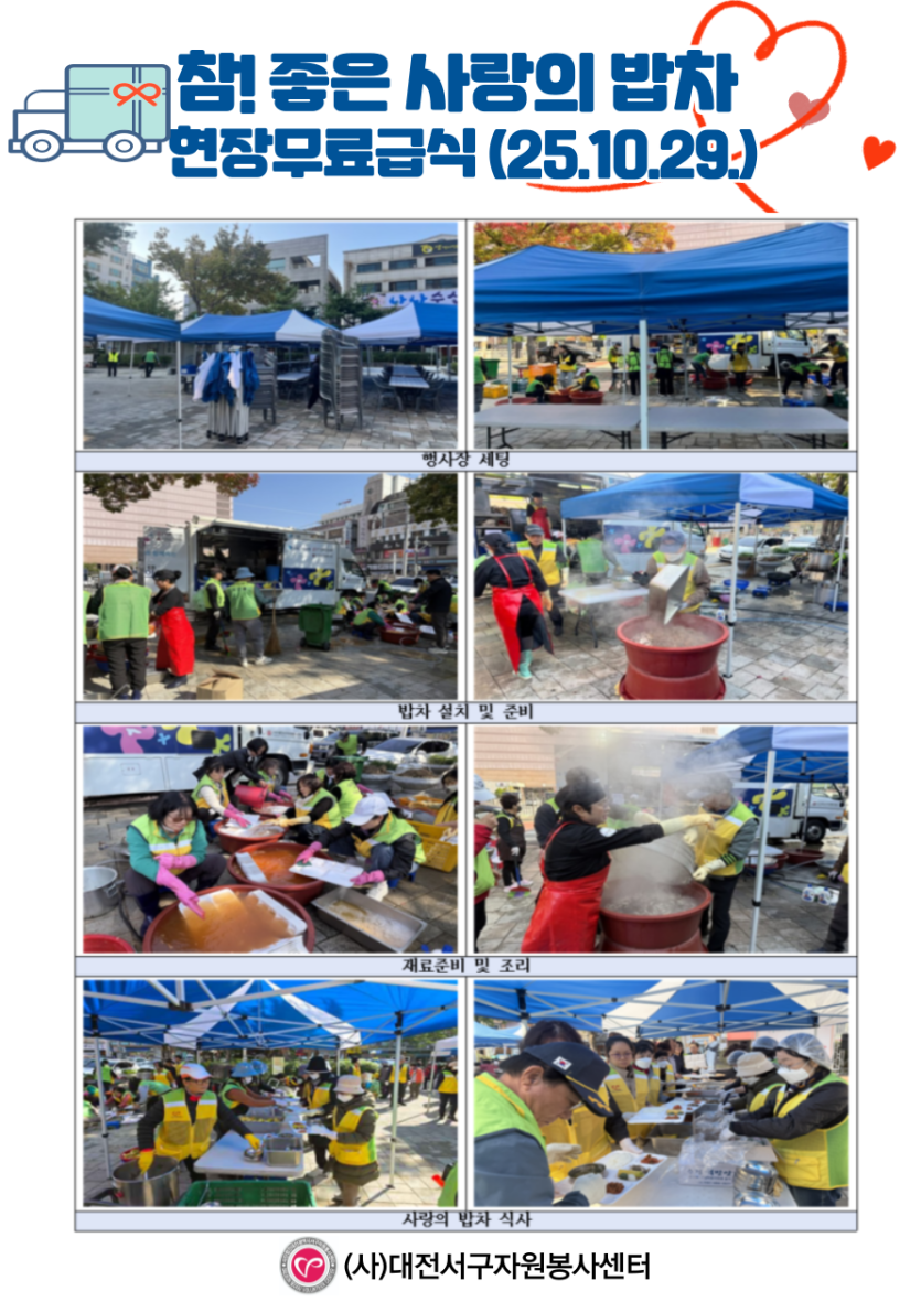 2025년 사랑의 밥차 현장 무료급식 봉사활동 사업 12회차(10월) 서구자원 0 15 11-11 (사)대전서구자원봉사센터에서는 「사랑의 밥차」현장 무료급식 봉사활동 사업 12회차 10월 29일(수) 운영을 마쳤습니다. 괴정동 우정가로공원 장소 협조하에 400여명을 대상으로 따뜻한 한끼를 제공했습니다. 추후, 안전을 우선으로 사랑의 밥차를 시행할 예정이오니 많은 관심 부탁드리겠습니다.