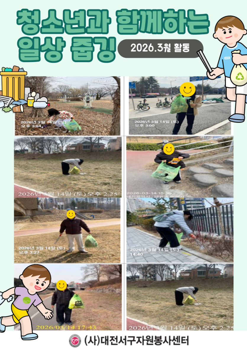 활동앨범 HOME 활동소식 활동앨범 활동소식 센터소개 자원봉사란 주요사업 활동소식 정보마당 활동앨범 공지사항 활동앨범 자원봉사마당 활동앨범 2026년 청소년 줍깅 플로깅 봉사활동(3월) 서구자원 0 3 04-08 2026년 청소년 줍깅 플로깅 봉사활동(3월) 0 Comments 로그인한 회원만 댓글 등록이 가능합니다. 이전 다음 목록
