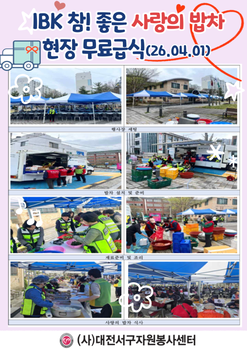 활동앨범 HOME 활동소식 활동앨범 활동소식 센터소개 자원봉사란 주요사업 활동소식 정보마당 활동앨범 공지사항 활동앨범 자원봉사마당 활동앨범 2026년 사랑의 밥차 현장무료급식 봉사활동(4월) 서구자원 0 2 04-08 2026년 사랑의 밥차 현장무료급식 봉사활동(4월) 0 Comments 로그인한 회원만 댓글 등록이 가능합니다. 다음 목록